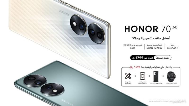 ويتميز HONOR 70 5G الجديد من الفئة العُليا بنظام كاميرا مميز مزود بكاميرا رئيسية مزدوجة ومستشعر SONY IMX800، علاوة على القدرات القوية لتصوير مدونات الفيديو في نمط الـSolo Cut لتصوير الـVlog الأول في القطاع. ويتوفر هاتف HONOR 70 5G (إصدار 8 + 256 جيجابايت) للطلب المسبق من الآن وحتى 24 أغسطس بسعر 1,999 ريالاً، بينما يتوفر HONOR 70 5G (إصدار 8 + 128 جيجابايت) بسعر 1,799 من خلال مكتبة جرير وSTC وإكسترا ونون ولولو ومتاجر البيع الأخرى. وسيحصل المستخدمون خلال فترة الطلب المسبق على هدايا مجانية بقيمة 1,596 ريالاً تتضمن ساعة HONOR MagicWatch 2 وضمان في دول مجلس التعاون وحماية للشاشة لمدة 6 أشهر وغطاء أصلي للهاتف PU. ويأتي كلا الإصدارين مع خدمات Google للهاتف.