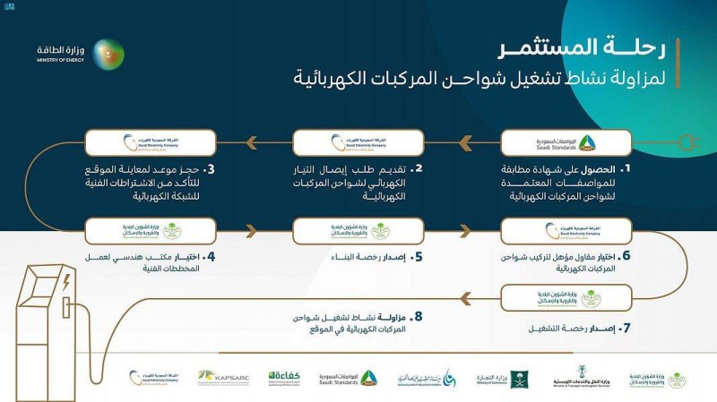 أعلن فريق البنية التحتية لمحطات شحن المركبات الكهربائية بقيادة وزارة الطاقة انتهاءه من جميع الجوانب التشريعية، والتنظيمية، والفنية، لتنظيم سوق نشاط شحن المركبات الكهربائية، من خلال تحديد التنظيمات اللازمة لتركيب محطات الشحن ومعداتها.