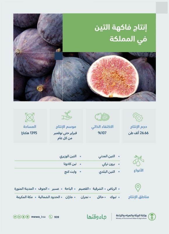 وأكد تقرير صادر من الوزارة ضمن حملة «جاء وقتها»، التي تستهدف نشر المعرفة بالمنتجات الزراعية، وزيادة التوعية بالخيارات المتنوعة للفواكه الموسمية ورفع كفاءة منظومة تسويق الفواكه المحلية لدعم المزارعين المحليين وزيادة نسبة عوائدهم المالية، أن موسم إنتاج فاكهة التين يبدأ من فبراير حتى نوفمبر من كل عام، وتعتبر من المحاصيل الواعدة التي يتم إنتاجها بكميات متفاوتة في مناطق الرياض والشرقية والقصيم والباحة وعسير والجوف والمدينة المنورة وتبوك وحائل ومكة المكرمة ونجران وجيزان والحدود الشمالية.