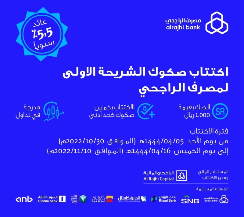أعلن مصرف الراجحي بدء طرح صكوك من الشريحة الأولى مقومة بالريال السعودي ابتداءً من يوم الأحد بتاريخ 30 أكتوبر 2022، وتعيين شركة الراجحي المالية مستشارا ماليا ومديرا للاكتتاب في ما يخص الطرح، وذلك بعد حصول المصرف على موافقة هيئة السوق المالية في تاريخ 20 أكتوبر2022 على طلب تسجيل وطرح الصكوك طرحا عاما.