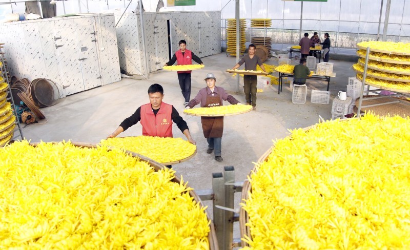 أظهر تقرير حديث، أن العديد من العمال المتطوعين يعملون على جمع زهور الأقحوان الذهبية، وذلك لتخزينها طوال فترة الشتاء للاحتفاظ بجودتها. وتظهر الصورة العديد من العمال خلال نقلهم الزهور في أطباق كبرى. (إيكونومي دايلي الصينية)