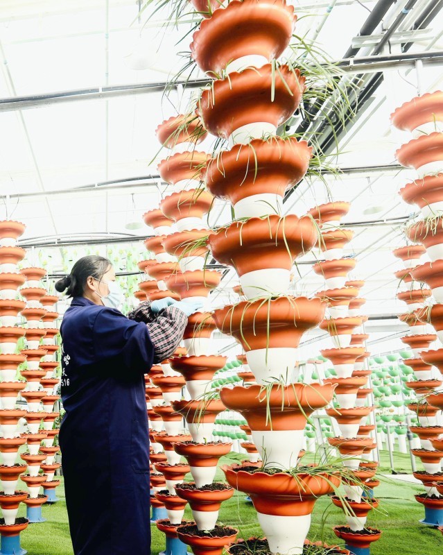 بدأ عدد من المزارعين، خلال الفترة الأخيرة، بالاعتماد على «التكنولوجيا الزراعية» عبر اعتماد زرع المحاصيل بلا تربة، ووضع العديد من الأنابيب الزراعية فوق بعضها البعض.. وتظهر الصورة إحدى العاملات في المحمية الزراعية خلال متابعتها المحصول. (إيكونومي دايلي الصينية)