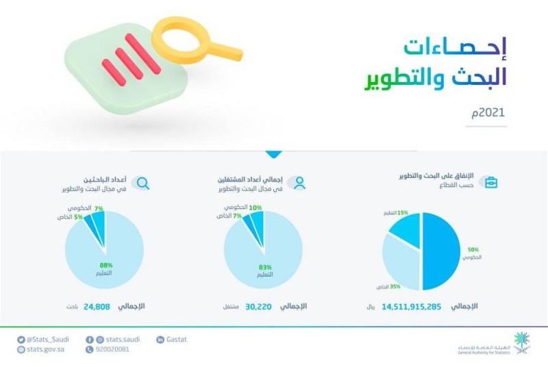 أصدرت الهيئة العامة للإحصاء اليوم (الأربعاء)، نشرة إحصاءات البحث والتطوير لعام 2021، التي كشفت أن إجمالي الإنفاق على البحث والتطوير بلغ 14.5 مليار ريال، فيما بلغت أعداد المشتغلين في هذا المجال 30,220 مشتغلا، وبلغ عدد الباحثين 24,808 باحثين خلال عام 2021.
