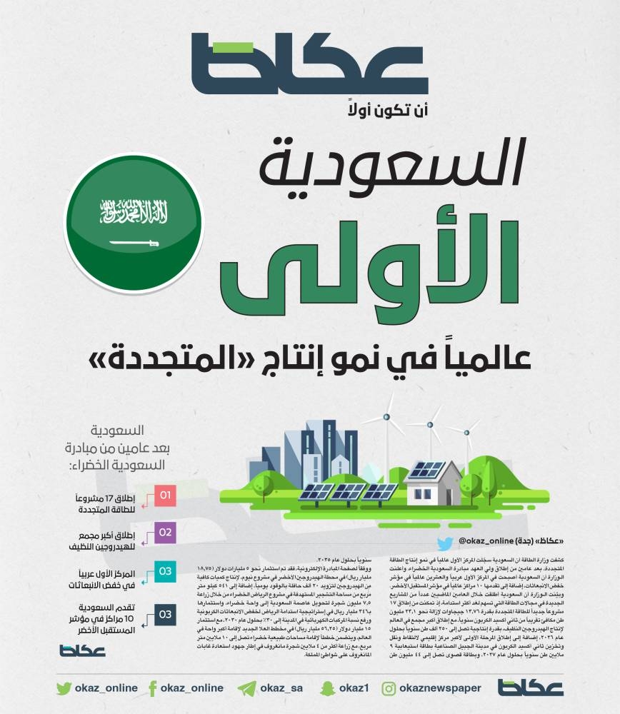 كشفت وزارة الطاقة أن السعودية سجّلت المركز الأول عالمياً في نمو إنتاج الطاقة المتجددة، بعد عامين من إطلاق ولي العهد مبادرة السعودية الخضراء، وأعلنت الوزارة أن السعودية أصبحت في المركز الأول عربياً والعشرين عالمياً في مؤشر خفض الانبعاثات، إضافة إلى تقدمها 10 مراكز عالمياً في مؤشر المستقبل الأخضر.