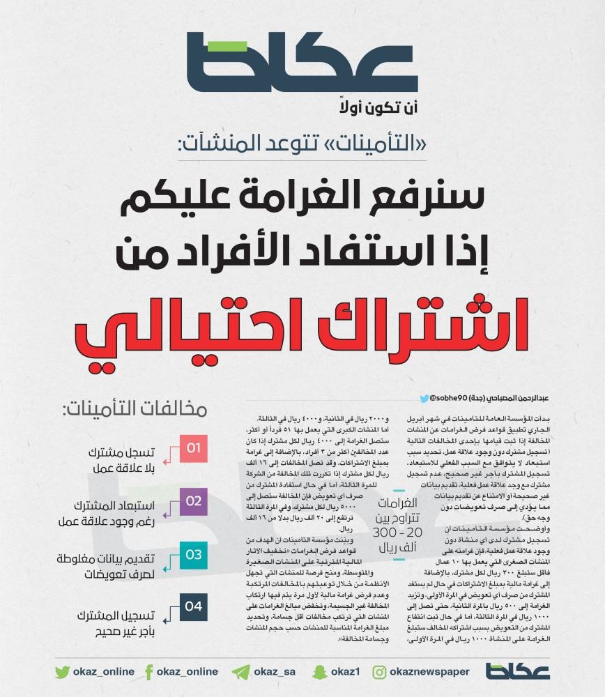 أما المنشآت الكبرى التي يعمل بها 51 فرداً أو أكثر، ستصل الغرامة إلى 4000 ريال لكل مشترك إذا كان عدد المخالفين أكثر من 3 أفراد، بالإضافة إلى غرامة بمبلغ الاشتراكات، وقد تصل المخالفات إلى 16 ألف ريال لكل مشترك إذا تكررت تلك المخالفة من الشركة للمرة الثالثة، أما في حال استفادة المشترك من صرف أي تعويض فإن المخالفة ستصل إلى 5000 ريال لكل مشترك، وفي المرة الثالثة ترتفع إلى 20 ألف ريال بدلا من 16 ألف ريال.