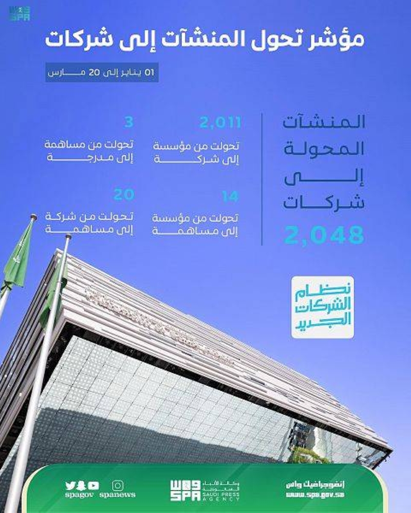 وأسهم النظام الجديد في تحويل 2048 منشآة، منها 2011 تحولت من مؤسسة إلى شركة وفق المعايير المحددة، كما تمكنت 20 شركة في التحول إلى شركة مساهمة، و14 مؤسسة من التحول إلى مساهمة و3 منشآت مساهمة إلى مدرجة خلال الربع الأول من عام 2023.