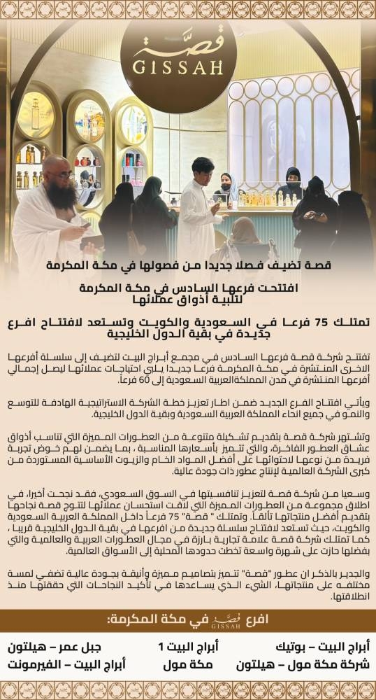 تفتتح شركة قصة فرعها السادس في مجمع أبراج البيت، لتضيف إلى سلسلة أفرعها الأخرى المنتشرة في مكة المكرمة فرعاً جديداً يلبي احتياجات عملائها، ليصل إجمالي أفرعها المنتشرة في مدن المملكة العربية السعودية إلى 60 فرعاً.