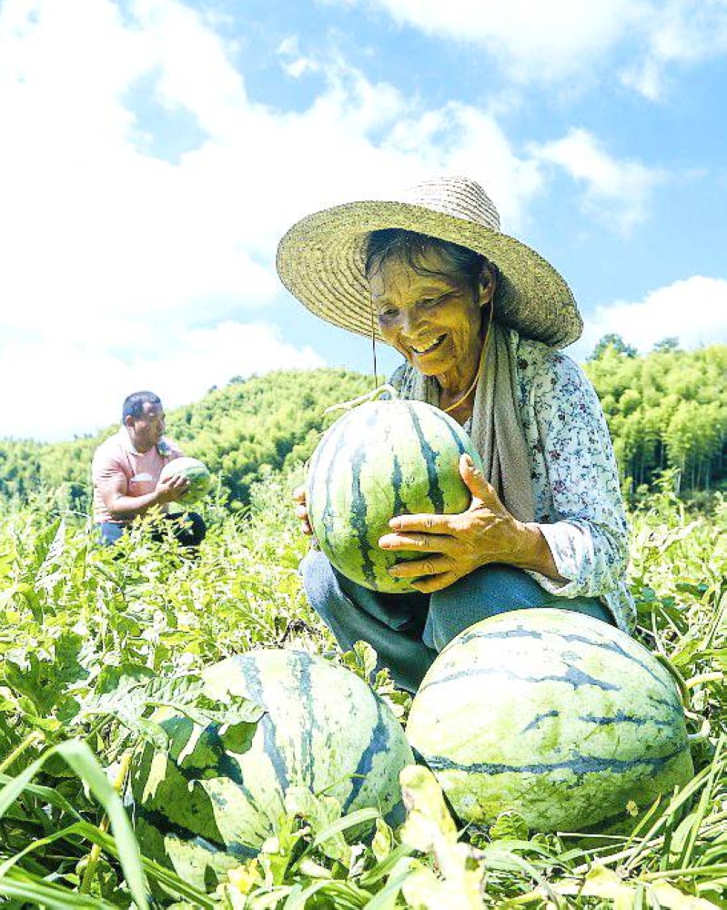 دخل البطيخ أخيراً في فترة ذروة الإنتاج والمبيعات لمدينة شينجان بمقاطعة هويتشو الصينية، وانشغل المزارعون بجمعه ونقله وتوريده للسوق. وفي الصورة، مزارعان يمسكان بحبات من محصول البطيخ. (إيكونومي دايلي الصينية)