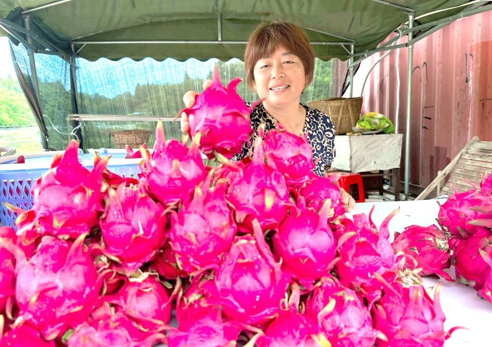 والسياحة، ومساعدة السكان على زيادة دخلهم. وفي الصورة، سيدة تعرض فاكهة التنين الصينية أمام منزلها. (إيكونومي دايلي الصينية)