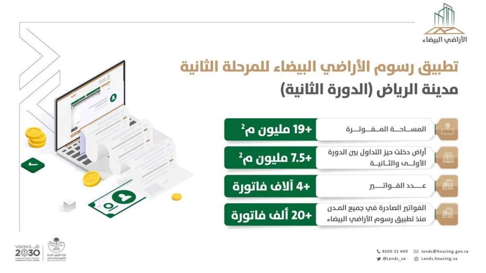 وأوضح البرنامج أن جهوده في زيادة المعروض من الأراضي المطورة بما يحقق التوازن بين العرض والطلب، وتوفير الأراضي السكنية بأسعار مناسبة، والحد من الممارسات الاحتكارية للأراضي؛ أسهمت في دخول أكثر من 2000 قطعة أرض ضمن حيّز التداول والبيع والشراء في السوق العقارية، تمهيدًا لوضعها ضمن المعروض العقاري أو إعمارها، وذلك بين الدورتين الفوتريتين الأولى والثانية من المرحلة الثانية في مدينة الرياض، حيث أُصدر في الدورة الثانية أكثر من 4 آلاف فاتورة على مساحات تصل إلى 19 مليون متر مربع، داعياً ملَّاك الأراضي الخاضعة للرسوم إلى المبادرة بإعمار أراضيهم أو السداد خلال سنة من تاريخ إصدار القرار.