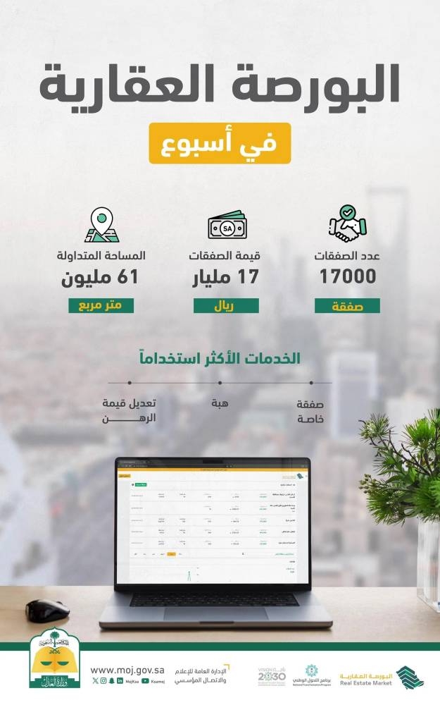 شهدت البورصة العقارية التابعة لوزارة العدل خلال الأسبوع الأول من تدشينها تداول نحو 61 مليون متر مربع لعقارات في مختلف مناطق السعودية، إذ بلغ إجمالي الصفقات 17 ألف صفقة بقيمة تجاوزت 17 مليار ريال.
