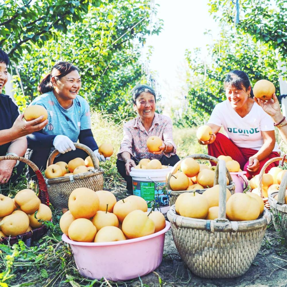 في قاعدة زراعة عسل الكمثرى في قرية هوانغزون، التابعة لمقاطعة شاندونغ (شرقي الصين)، يقوم المزارعون في تلك الأوقات من العام بقطف عسل الكمثرى.. وفي الصورة مزارعات مسرورات بقطف المحصول. (إيكونومي دايلي الصينية)