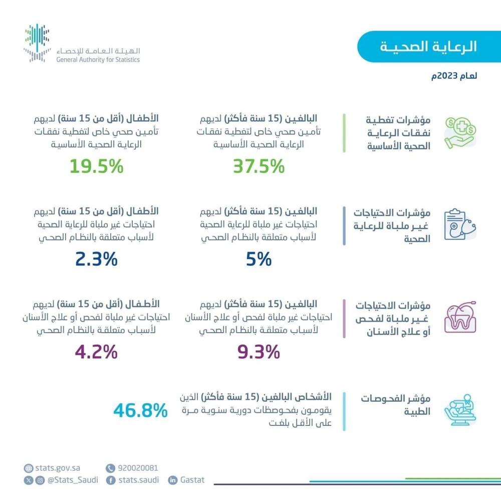 وأوضحت نتائج نشرة إحصاءات الرعاية الصحية لعام 2023، أن نسبة سكان السعودية البالغين (15 عامًا فأكثر) الذين لديهم تأمين صحي خاص لتغطية نفقات الرعاية الصحية الأساسية بلغت 37.5%، بينما بلغت نسبة سكان السعودية من الأطفال (أقل من 15عامًا) ولديهم تأمين صحي خاص لتغطية نفقات الرعاية الصحية الأساسية 19.5%.