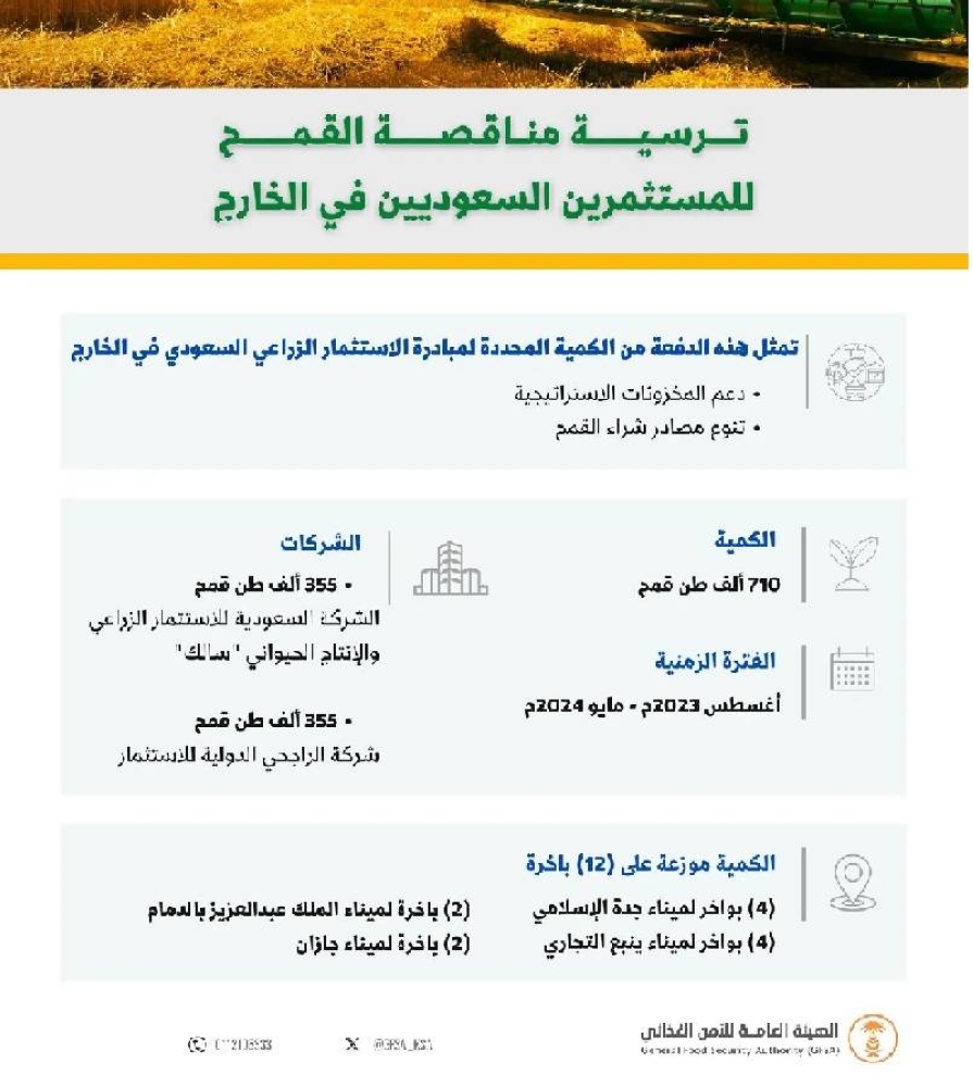 وتدعو الهيئة العامة للأمن الغذائي جميع المستثمرين السعوديين إلى الاستفادة من هذه المبادرة والتقدم للتأهيل للمنافسات خلال الأعوام القادمة. ويمكن للمهتمين استعراض سعر الترسية من خلال موقع الهيئة الإلكتروني: https://www.gfsa.gov.sa/Import/Wheat