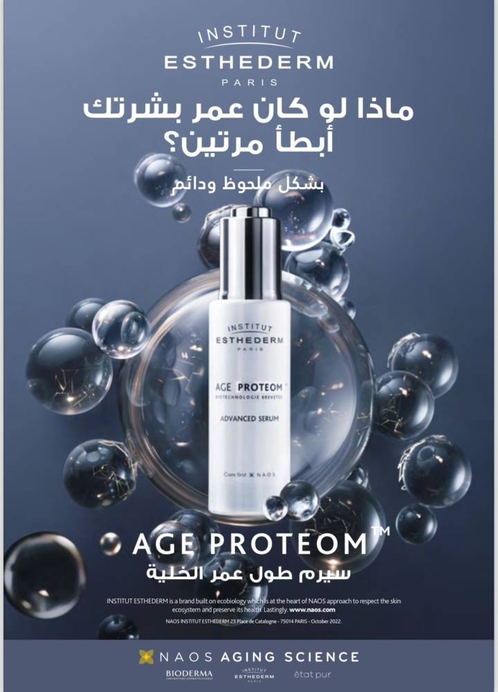 أطلق السيروم الجديد ضمن مجموعة Esthederm وهو منتج جديد ومطور يحمى بروتينات خلايا البشرة مما يساعد في إطالة عمر الخلايا ويؤدي إلى تأخير ظهور علامات تقدم عمر البشرة. هذا المنتج هو سيروم إيدج بروتيومAGE PROTEOM، الذي يعتمد على تكنولوجيا مميزة هي بمثابة ثورة علمية ستغير قواعد اللعبة في كيفية التعامل مع شيخوخة البشرة، لأنه يعمل ببساطة على حماية خلايا البشرة من خلال حماية بروتيناتها الهيكلية والوظيفية التي تشكل نحو 20 % من مكونات جسم الإنسان، وكذلك حماية البروتيوم الخاص بها، ما يساعد على حماية البشرة وتأخير ظهور جميع أعراض شيخوخة البشرة بمعدل الضعف، عن استخدام منتجات أخرى؛ إضافة إلى أنه يعزز الكولاجين والإيلاستين ويمنع فقدان كثافة وحيوية ومرونة البشرة.
