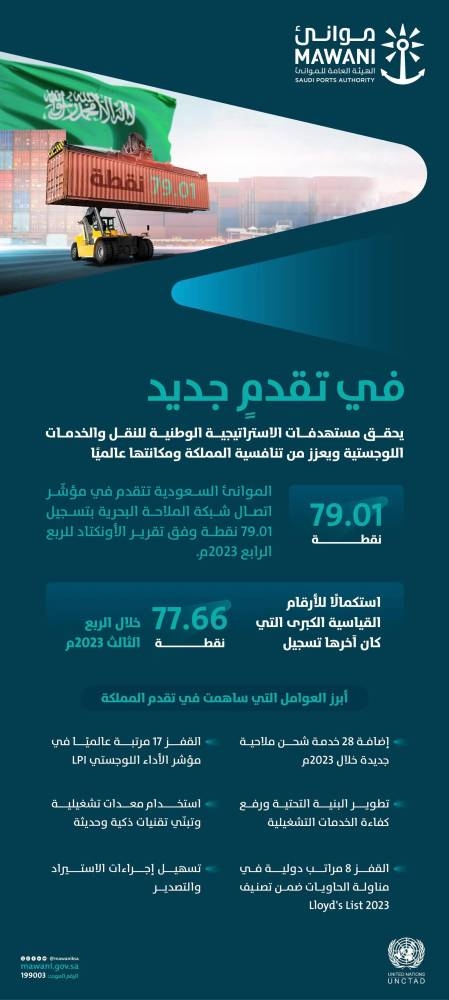 حققت المملكة ممثلة في الهيئة العامة للموانئ «موانئ» -في تقدمٍ جديد يحقق مستهدفات الاستراتيجية الوطنية للنقل والخدمات اللوجستية، ويعزز من تنافسية المملكة ومكانتها عالمياً- أعلى تقدم في مؤشر اتصال شبكة الملاحة البحرية، ضمن تقرير الأونكتاد للربع الرابع 2023م، الصادر عن مؤتمر الأمم المتحدة للتجارة والتنمية، بتسجيل 79.01 نقطة، وذلك استكمالاً للأرقام القياسية الكبرى التي كان آخرها تسجيل 77.66 نقطة خلال الربع الثالث 2023م.
