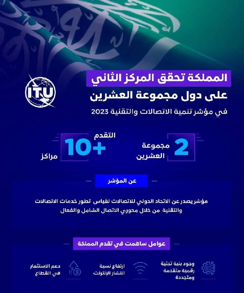 أعلن الاتحاد الدولي للاتصالات (ITU) عن تحقيق المملكة المركز الثاني على دول مجموعة الـ20، في مؤشر تنمية الاتصالات والتقنية (IDI) 2023، مسجلة المملكة بذلك تقدمها 10 مراكز على دول مجموعة الـ20 في المؤشر الذي يرصد اقتصادات 169 دولة، لقياس تقدمها في خدمات الاتصالات والتقنية من خلال عدد من المؤشرات الفرعية المقسمة على محوري الاتصال الشامل والفعال، بهدف قياس تحقيق معايير قوة البنية التحتية وتوفير اتصال آمن وفعال للجميع.