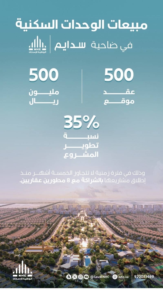 أعلنت الشركة الوطنية للإسكان NHC عن ارتفاع نسبة الإنجاز في «ضاحية سدايم» السكنية الواقعة في شمال أبحر بمدينة جدة، إلى أكثر من 35%، كما تجاوزت العقود الموقعة في الضاحية 500 عقد بقيمة تخطت 500 مليون ريال وذلك في فترة زمنية لا تتجاوز الخمسة أشهر منذ إطلاق مشاريعها بالشراكة مع 8 مطورين عقاريين.