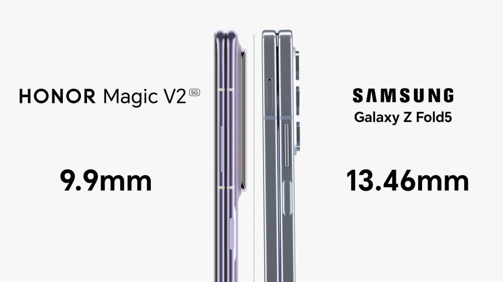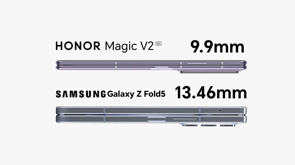 عندما يتعلق الأمر بالمنافسة، فإن التصميم النحيف لهاتف HONOR Magic V2 مقاس 9.9 ملم يتفوق على منافسيه مثل Samsung Galaxy Z Fold5 والذي يأتي بسمك 13.46 ملم. يتميز HONOR Magic V2 بأنه الأخف والأنحف في فئته ويشبه في سُمكه الهواتف الذكية العادية مثل S24 Ultra وiPhone 14 Pro Max. يمنح هذا التصميم HONOR Magic V2 ميزة تنافسية، حيث يجمع بسلاسة بين عامل الشكل النحيف والميزات الرائدة القابلة للطي وشاشة داخلية غامرة مقاس 7.92 بوصة.
