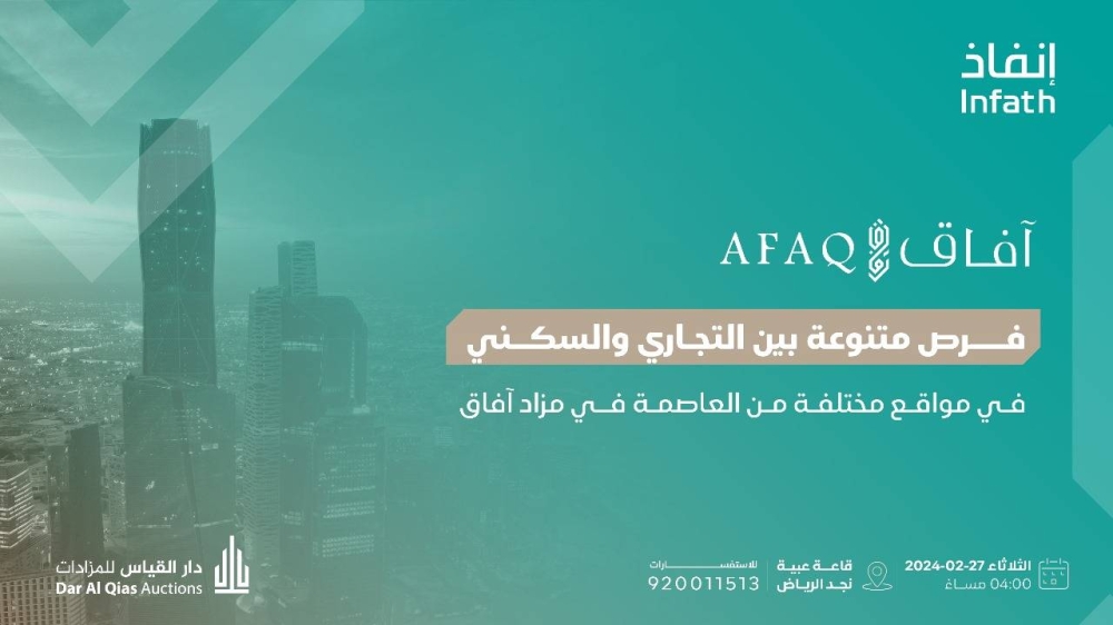 تعلن شركة دار القياس للمزادات وبإشراف مركز الإسناد والتصفية «إنفاذ» وبقرار من محكمة التنفيذ والأحوال الشخصية، إقامة مزاد «آفاق» الحضوري وذلك يوم الثلاثاء 27 فبراير 2024 في قاعة عبية نجد بمدينة الرياض.