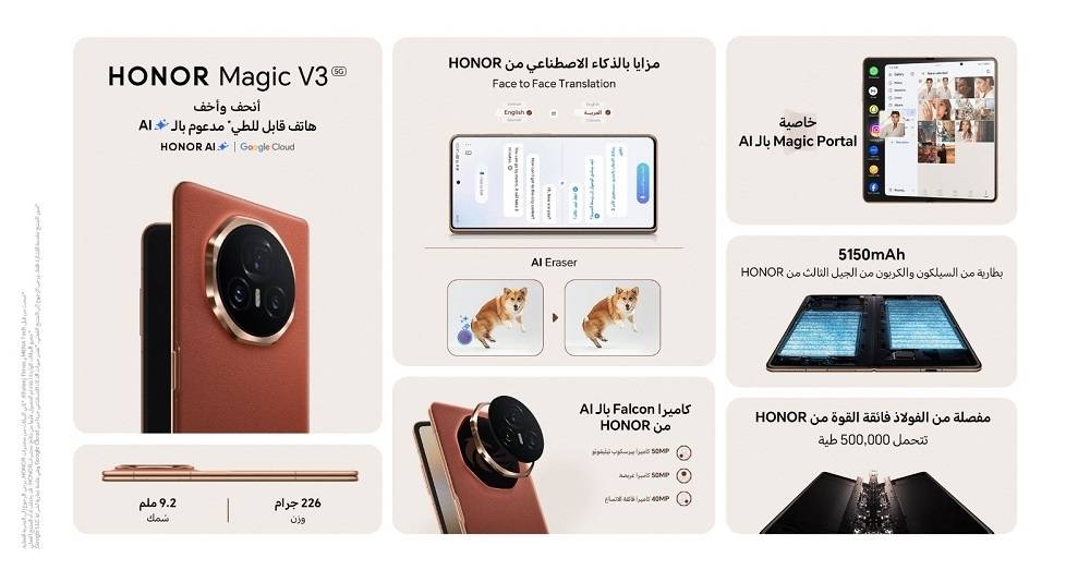قامت شراكة بين HONOR وGoogle Cloud لتقديم تجارب ذكاء اصطناعي أكثر سهولة وفعالية. مع استمرار HONOR في تلبية الاحتياجات المختلفة لمستخدمي الهواتف القابلة للطيّ، فإن Google Cloud تسعى إلى تحسين مجموعة من ميزات الأعمال بقدرات الذكاء الاصطناعي بما في ذلك Face to Face Translation، وHONOR Notes وAI Eraser لزيادة الإنتاجية. عندما يقوم المستخدمون بتفعيل ميزة Face to Face Translation، يكون HONOR Magic V3 قادراً على توفير ترجمة فورية أثناء المحادثات الشخصية، بغض النظر عما إذا كان الجهاز مطوياً أو غير مطوي. وقد تم تزويد HONOR Notes على HONOR Magic V3 بقدرات جديدة مدعومة بالذكاء الاصطناعي، مما يوفر خصائص شاملة ومريحة والتي تتوقع احتياجات المستخدم. تستخدم خاصية تحويل الصوت إلى نص في HONOR Notes خاصية التعرف على الصوت بالذكاء الاصطناعي لفهم المدخلات الصوتية للمستخدم بوضوح وترجمتها إلى تطبيق الملاحظات.