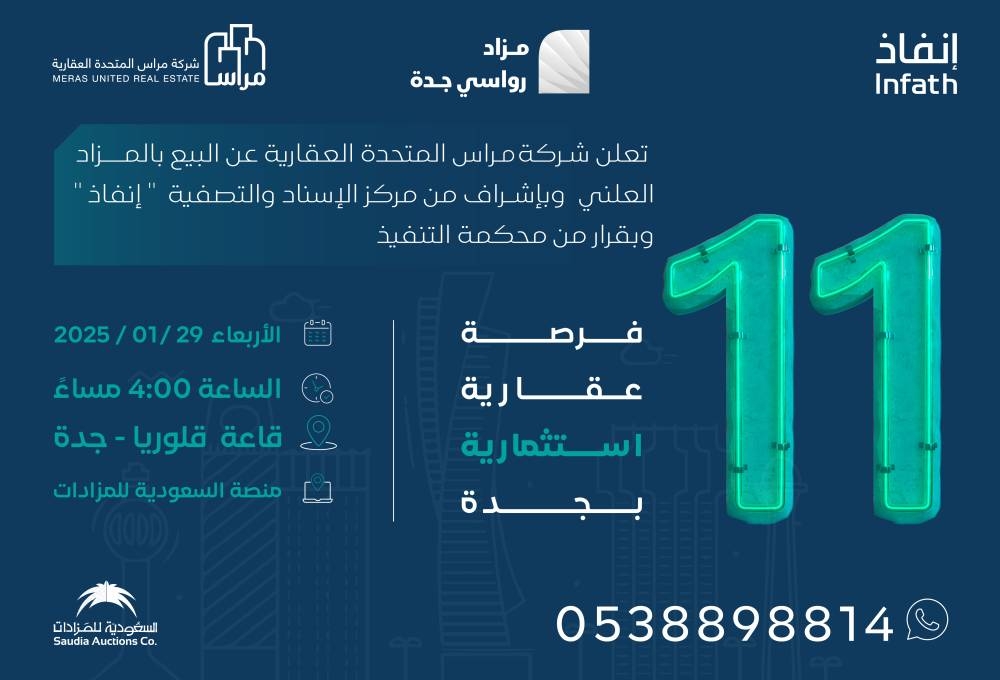 ويعتبر المزاد فرصة جاذبة للراغبين عن الفرص الاستثمارية الواعدة، كما ترحب شركة مراس المتحدة العقارية بجميع الاستفسارات من خلال التواصل على.0538898814