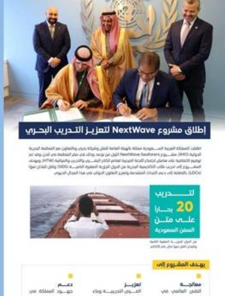 أطلقت المملكة ممثلة بالهيئة العامة للنقل وشركة بحري وبالتعاون مع المنظمة البحرية الدولية (IMO)، مشروع NextWave Seafarers الأول من نوعه في مقر المنظمة في لندن.