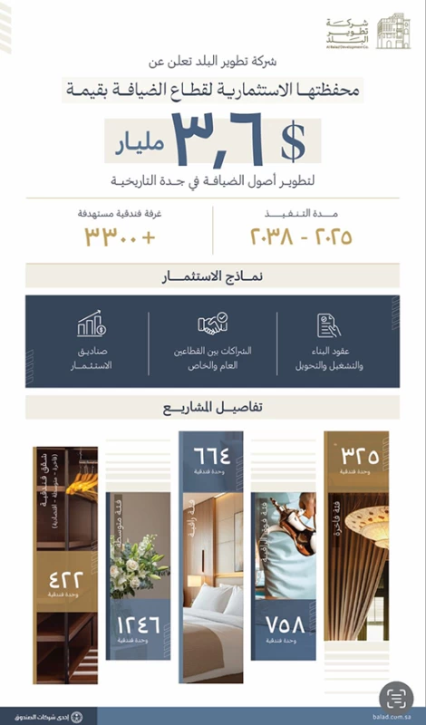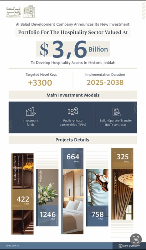 The Development of Al-Balad Company, one of the Public Investment Fund's companies and the main developer for the revitalization of the historic Jeddah area "Al-Balad," announced the launch of its investment portfolio for the hospitality sector valued at $3.6 billion; aimed at developing hotels in historic Jeddah, including the rehabilitation and development of a range of hospitality assets in the region. This announcement was made during the global "Tourism" forum held in Riyadh from November 11 to 13, 2025, with the participation of leaders from the public and private sectors, in the largest global platform specialized in tourism aimed at unifying efforts, innovating solutions, and stimulating transformative investments in the tourism sector.