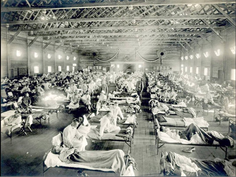 ظهر فايروس الإنفلونزا الإسبانية في قاعدة فورت رايلي، بكنساس، حيث يتم تدريب 50 ألف مجند للجيش الأمريكي. تقدم مجند إلى قسم الرعاية الصحية بالقاعدة مشتكياً من ارتفاع درجة حرارته. وقبل أن تنتهي ساعات اليوم تقدم مئات المجندين بالشكوى نفسها! وبعد نحو شهرين زجت الولايات المتحدة بمزيد من جنودها في الحرب، فنقل الجنود الأمريكيون الفايروس معهم إلى القارة الأوروبية. يبدأ الفايروس بالحمى، ثم يتلاشى الهواء في رئتي المصاب. وما يلبث أن يتقيأ دماً، وينزف دماً من أنفه، حتى الموت.