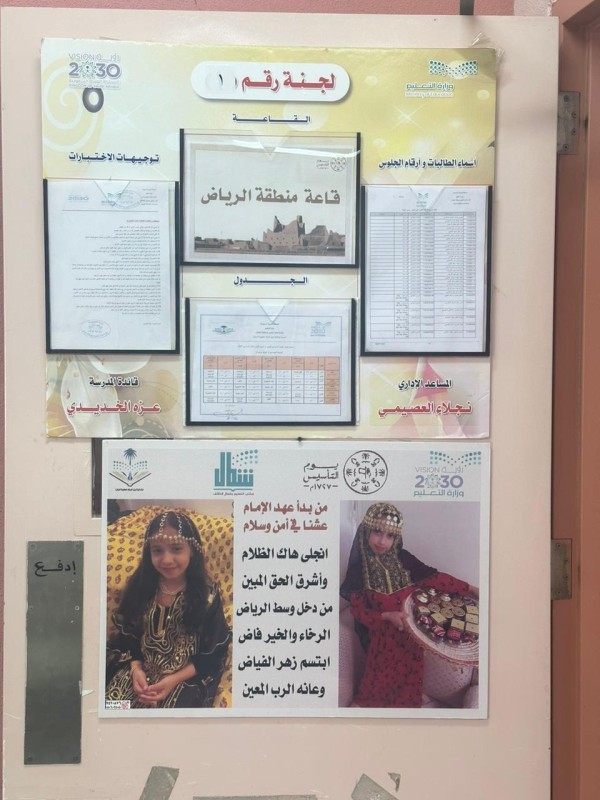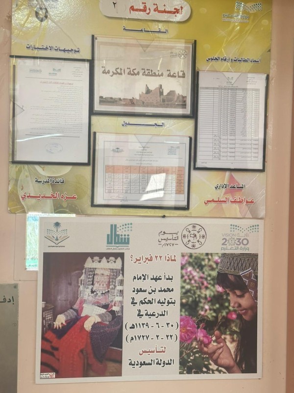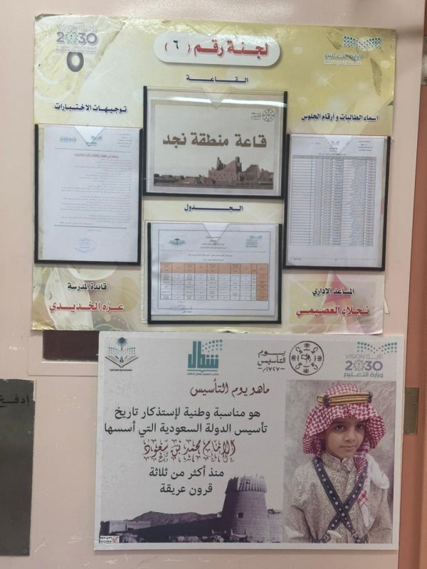 وتضمنت اللوحات الإرشادية باللجان تاريخ يوم التأسيس ومناسبته ومن مؤسس الدولة السعودية، ومن أين بدأت وانطلقت، ما أضفى جمالاً في قاعات الاختبار.