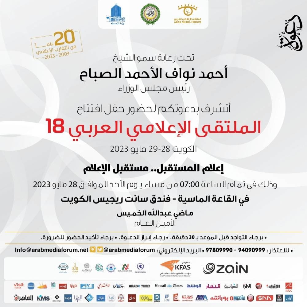 ويدشن الملتقى أعماله صباح غد (الأحد) بافتتاح معرض (وسائل الإعلام وتكنولوجيا الاتصال والتطبيقات الإلكترونية)، وتليه الجلسة الأولى بعنوان (مستقبل الإعلام.. إعلام المستقبل)، بمشاركة الأمين العام المساعد لقطاع الإعلام والاتصال في جامعة الدول العربية السفير أحمد خطابي، ورئيس تحرير صحيفة (عكاظ) السعودية جميل الذيابي، ورئيس تحرير صحيفة (الرؤية) العمانية حاتم الطائي، ورئيس تحرير صحيفة (الرأي) الكويتية وليد الجاسم، وبإدارة وكيل قطاع النشر والصحافة بوزارة الإعلام الكويتية لافي السبيعي.
