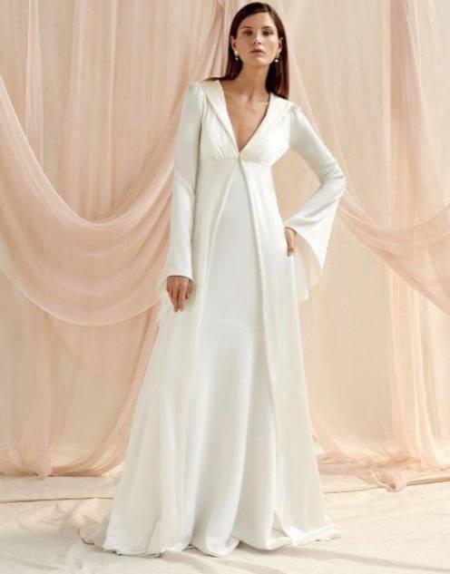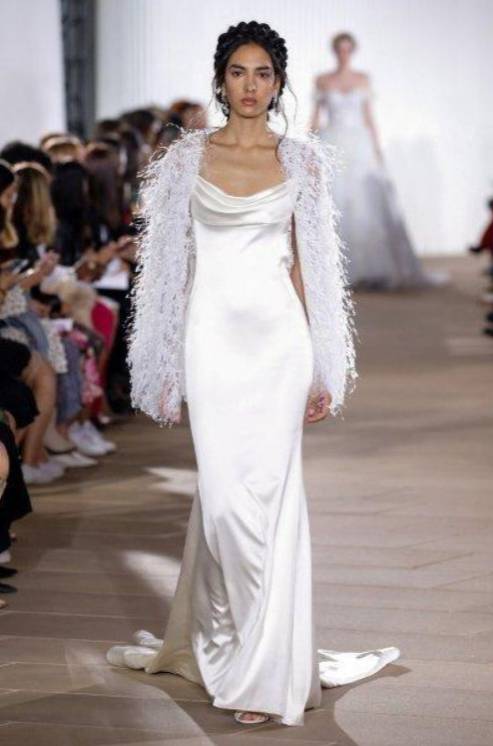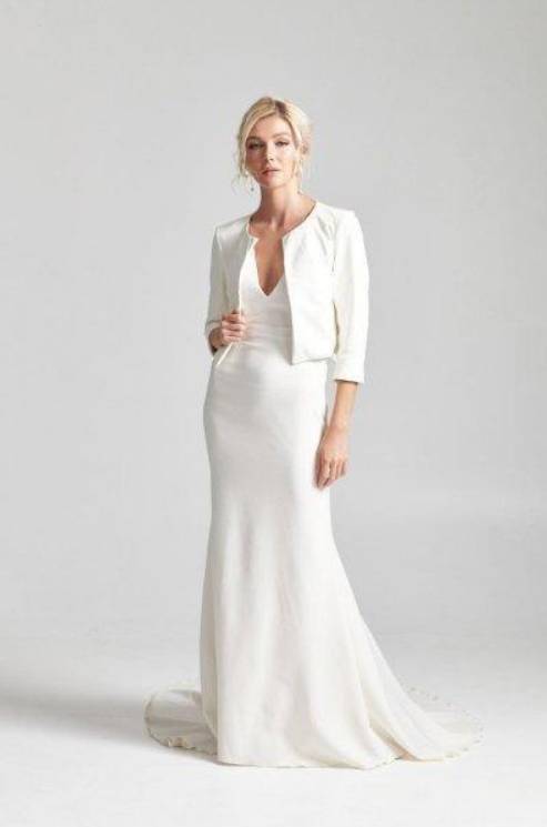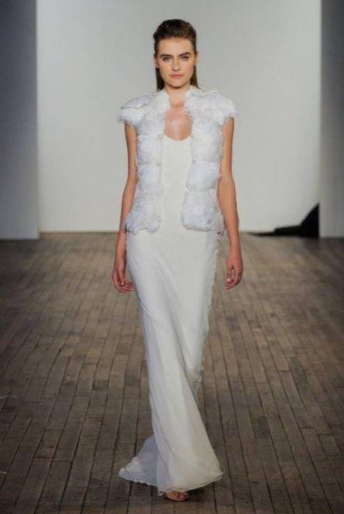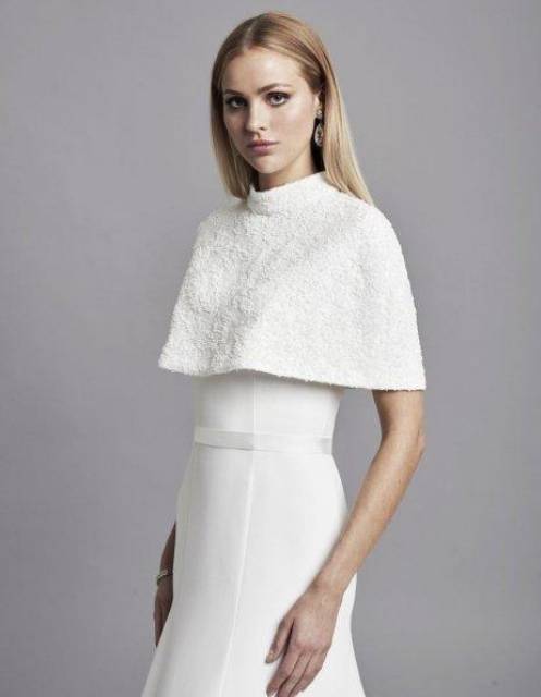 كما قدمت ماركة Caroline Castigliano فستان زفاف بسترة قصيرة تنسدل على الكتفين لتمنحك الدفء في يوم العرس، أيضاً قدمت ماركة Rebecca Schoneveld فستان زفاف ناعما مع سترة قصيرة بتصميم بسيط ومفتوحة من الأمام.