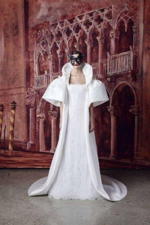 أما ماركة Isabelle Armstrong فقدمت فستان زفاف كلاسيكيا راقيا مع سترة طويلة ومفتوحة من الأمام وبأكمام منفوخة.