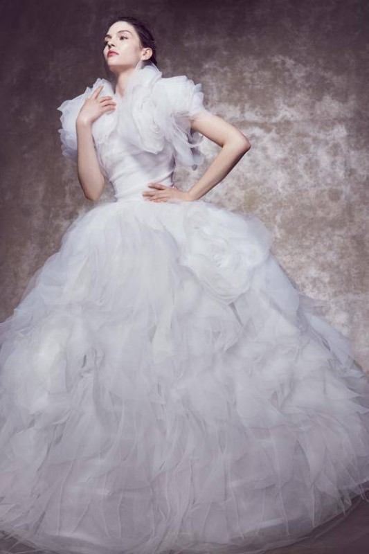موضة الأكتاف المنسدلة مازالت مسيطرة على عالم الموضة بشكل لم نكن نتوقعه، حتى بفساتين الزفاف المختلفة، يمكنك اعتماد هذا الفستان الأنيق من مونيك لوليير، مزركش بسيط بنفس الألوان، ليمنح الصبية إطلالة ناعمة وفخمة بالوقت نفسه. ويأتي هذا التصميم الأنيق ورائع للعرائس الممتلئات وقصيرات القامة، فلن يخفي فقط عيوب الأرداف الممتلئة، ولكن اللمسة الطبقي التي اعتمدها زهير مراد للفستان، سوف تجعلك تبدين أطول، وبالتالي أكثر رشاقة.