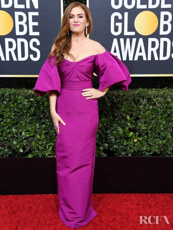 اختارت النجمة فستاناً راقياً باللون الفوشي من توقيع المصمم Monique Lhuillier، وتميز الفستان بالأكمام المنفوخة التي أصبحت حديث شارع الموضة.