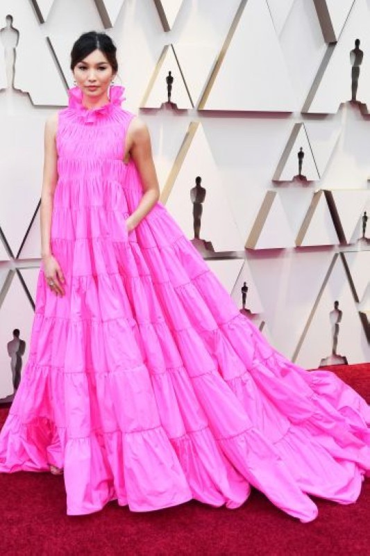 اختارت النجمة فستانا متعدد الطبقات باللون الوردي من تصميم دار الأزياء العالمية أرماني.
