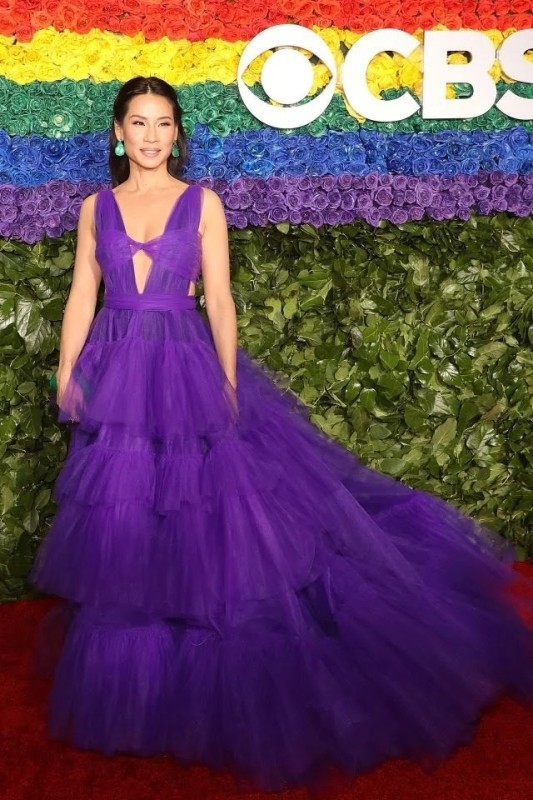 وقع اختيار النجمة لوسي لو على فستان من التل البنفسجي ذي طبعات عديدة منفوشة من تصميم christian siriano