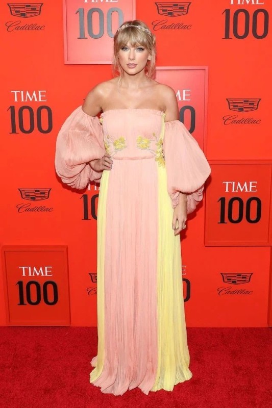 ارتدت النجمة تايلور سويفت فستانا من الشيفون الأصفر والوردي مطرزا بالذهبي من تصميم J. Mendel