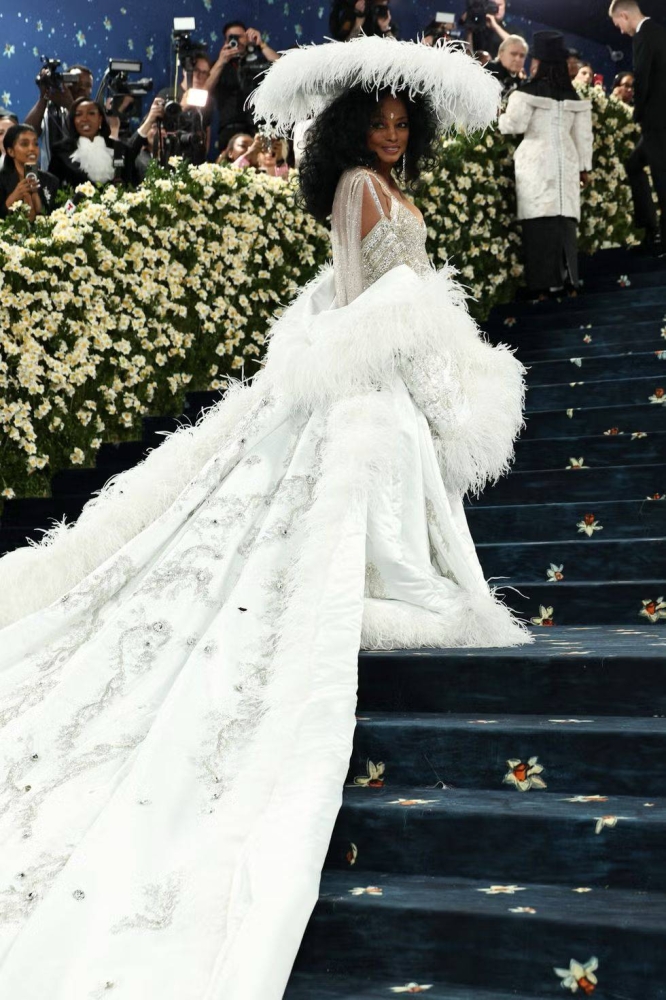 ظهرت النجمة الأسطورية بفستان فضي مرصّع بالريش وقبعة ضخمة، تميز بوجود تطريز بأسماء أبنائها وأحفادها على الكاب الطويل. شكّلت هذه الإطلالة عودة قوية لها بعد غياب طويل عن الحدث.