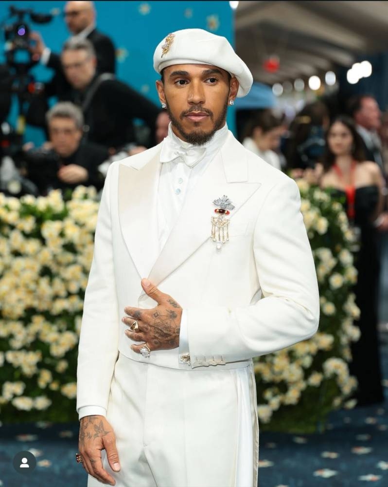 اختار هاميلتون بدلة مصممة خصيصًا من توقيع Grace Wales Bonner، تميزت بتفاصيل دقيقة تعكس التراث الثقافي، مع لمسات عصرية تُبرز اهتمامه بالموضة كوسيلة للتعبير عن الهوية.