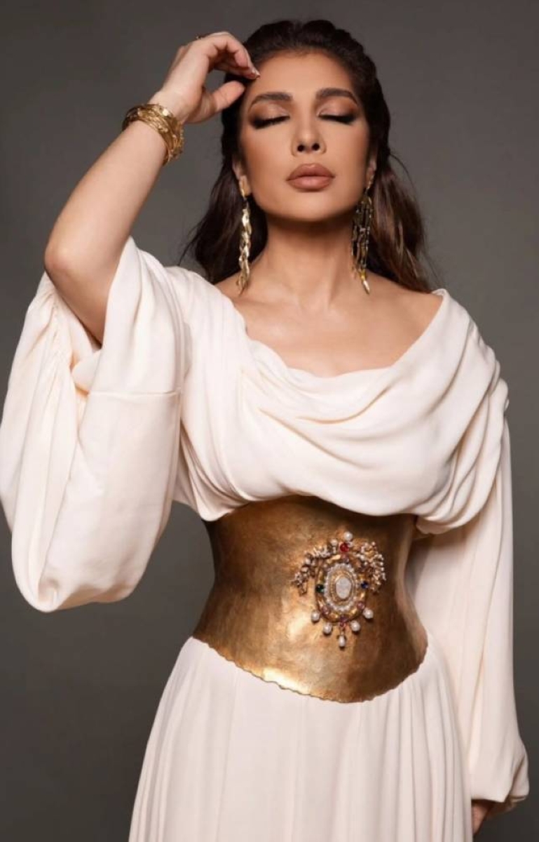 The corset added a touch of boldness and femininity, and the look was completed with distinctive jewelry, an elegant hairstyle featuring a large braid, and warm Eastern makeup that gave her an air of luxury and sophistication amidst the applause and cheers of the audience in an exceptional musical atmosphere.