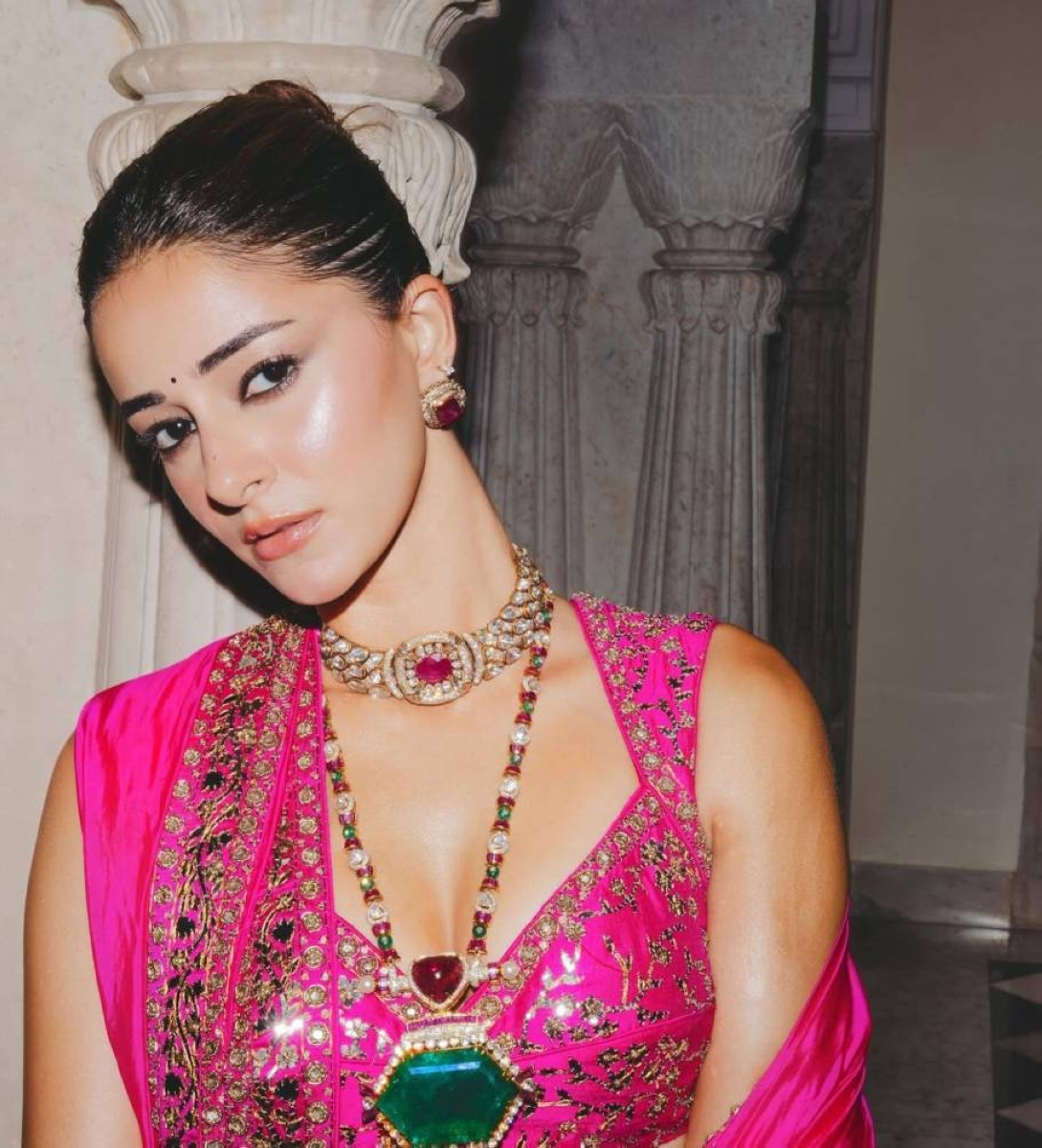 Ananya Panday appeared in a traditional Indian Lehenga dress in a bright pink color, specially designed for the Punit Balana brand.