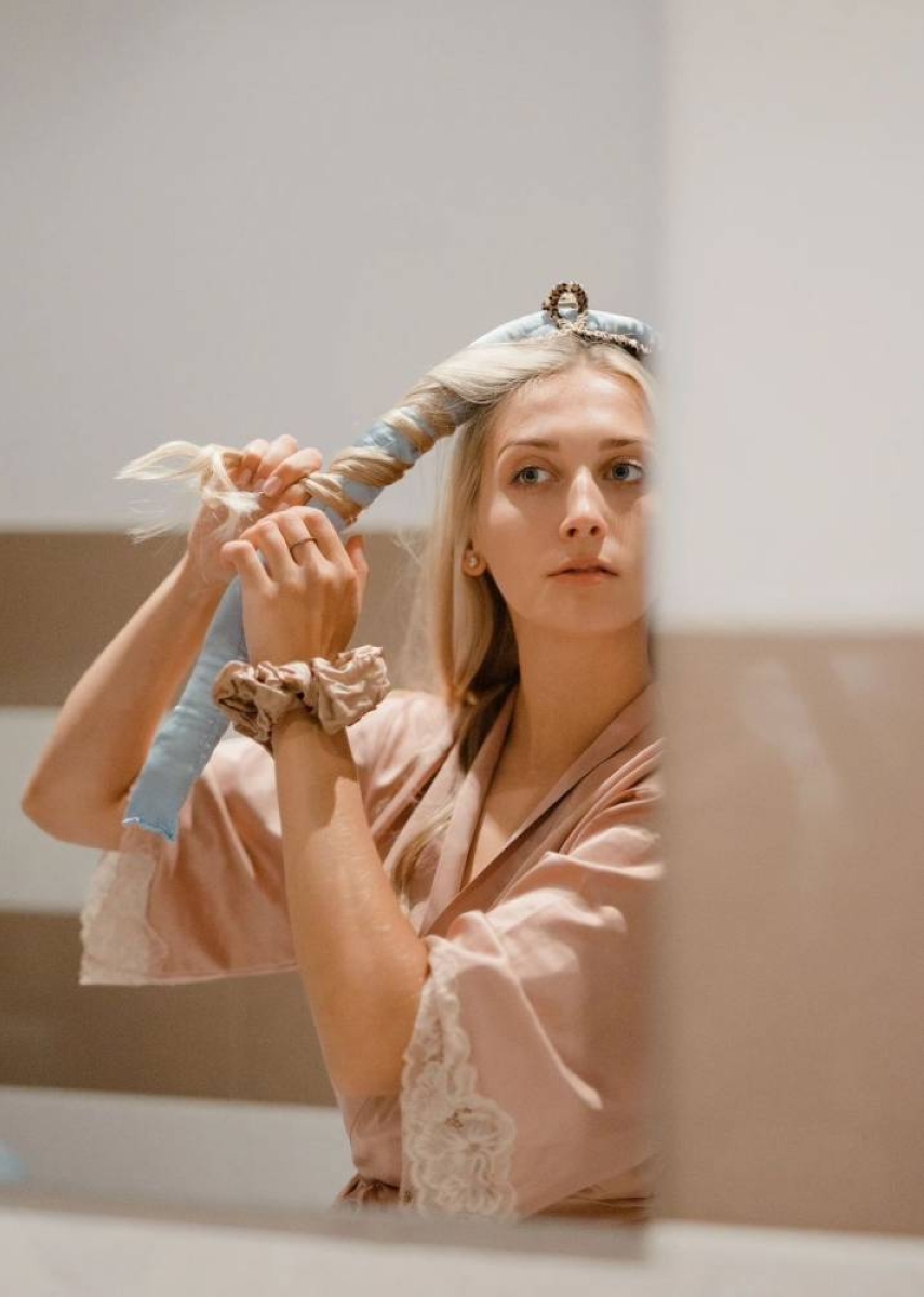 Sections of hair are wrapped around soft rollers after being slightly dampened, and the hair is left to dry naturally. This method gives the hair volume and even waves without causing any heat damage, and the size of the rolls can be adjusted as desired to achieve large or small waves.