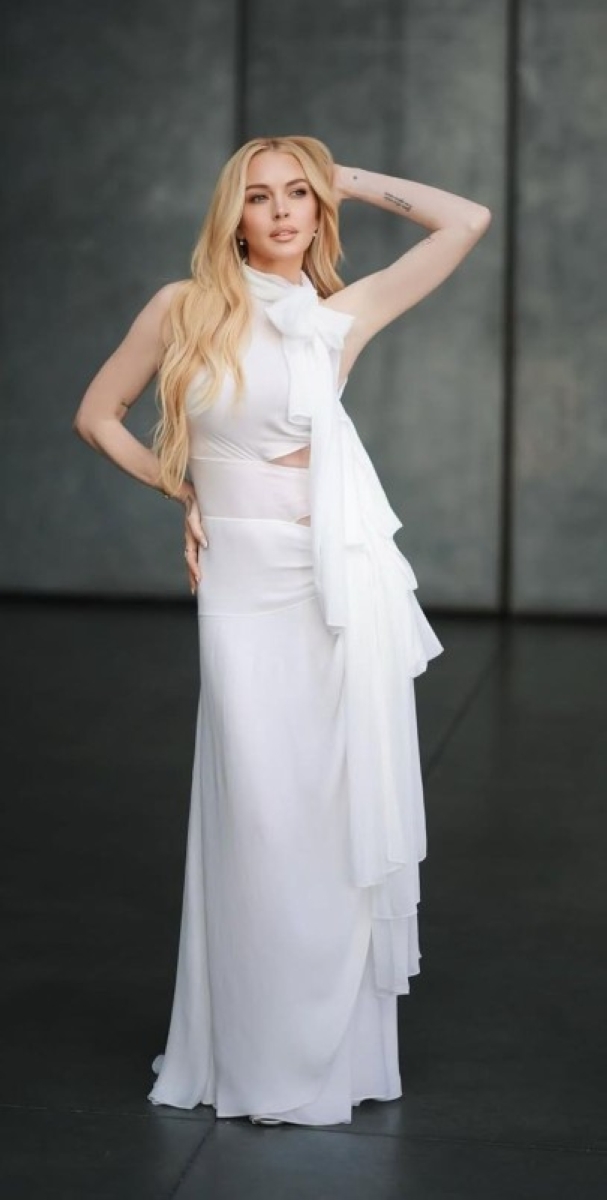 Lindsay Lohan made a stunning appearance in a new photoshoot wearing an elegant white dress that captivated attention with its beauty and delicacy, confirming her strong return to the fashion scene after a period of absence. The dress featured a sophisticated design that combined simplicity and boldness, characterized by soft, flowing fabric with two side slits that added femininity to the look, along with a high collar tied with a chic ribbon at the neck, giving it a classic touch with a modern twist.