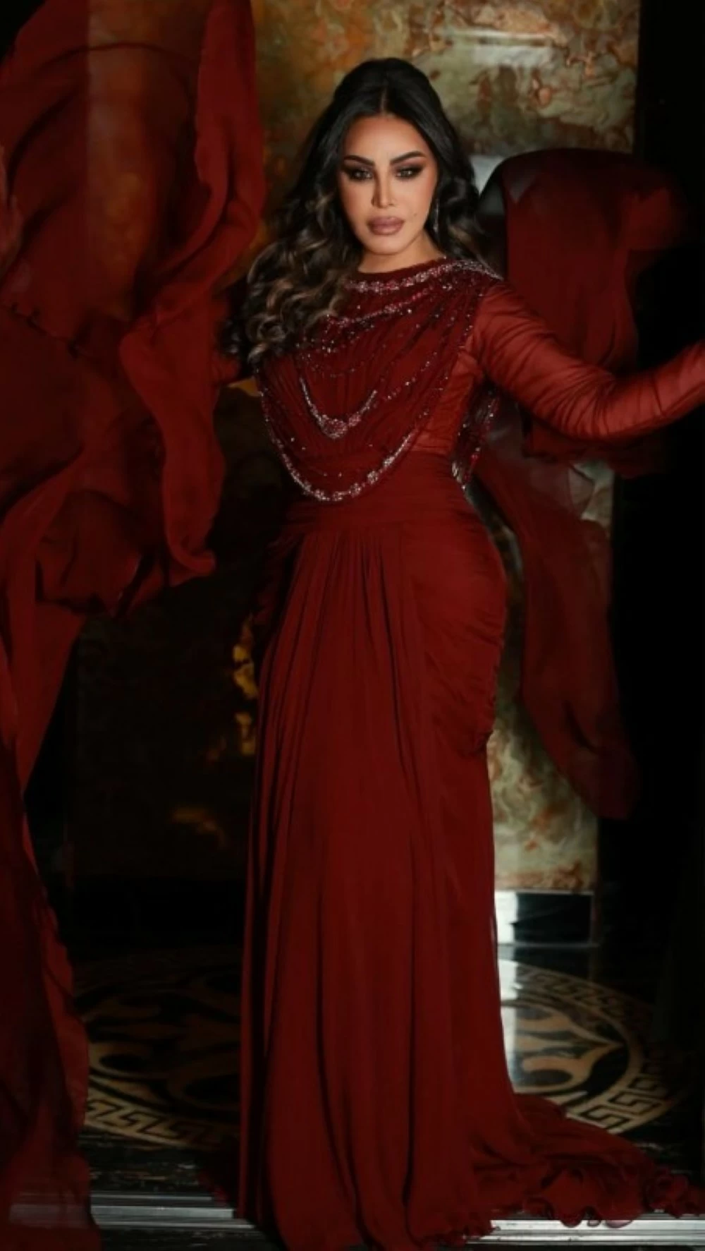 The star Ahlam shared with her followers a distinctive look centered around a deep red color, as she chose a luxurious dress with an elegant design that reflects both classic and modern sophistication.