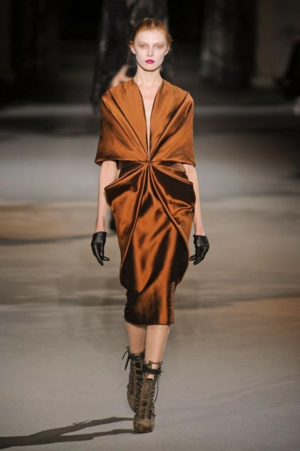 برز اللون النحاسي بقوة في الفساتين الانسيابية والتصاميم ذات القصّات المنحوتة، خصوصاً عند تنفيذه بخامات لامعة أو مطفأة جزئياً تعكس الضوء بطريقة مدروسة، ما أضفى على القطع طابعاً عصرياً مع لمسة احتفالية راقية. في المقابل، جاء البرونزي أكثر هدوءاً وعمقاً، مستخدماً في التايورات، المعاطف، والقطع ذات الطابع العملي الفاخر، ليمنح الإطلالة إحساساً بالقوة والثبات مع أناقة ناضجة.