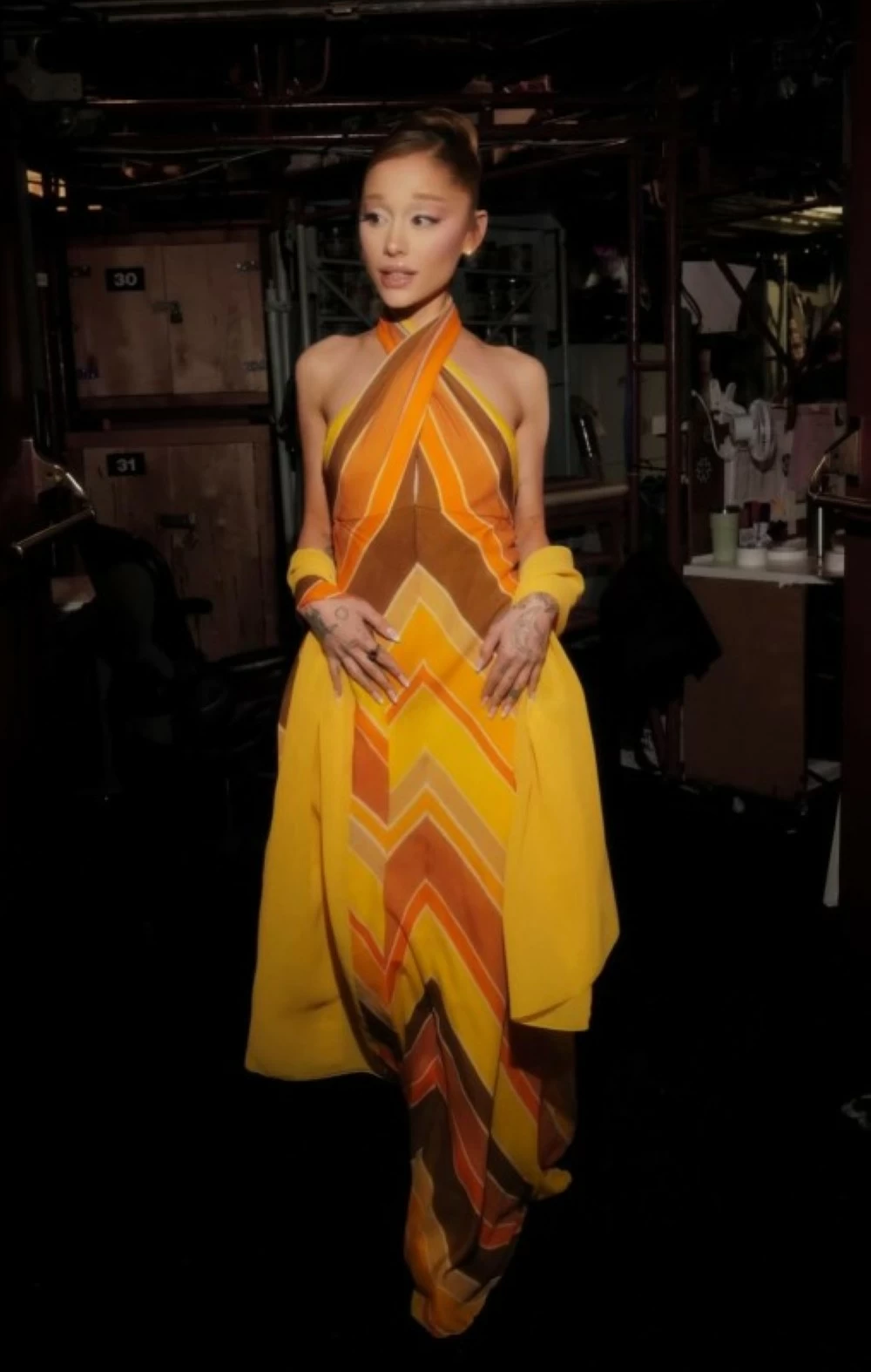ظهرت أريانا غراندي بإطلالة مميّزة حيث ارتدت فستانًا بتدرّجات ألوان دافئة تميل للبرتقالي والبني والأصفر مستوحى من أزياء السبعينات، وقد لفت هذا التصميم الأنظار بقصته الكلاسيكية وخطوطه الجريئة.