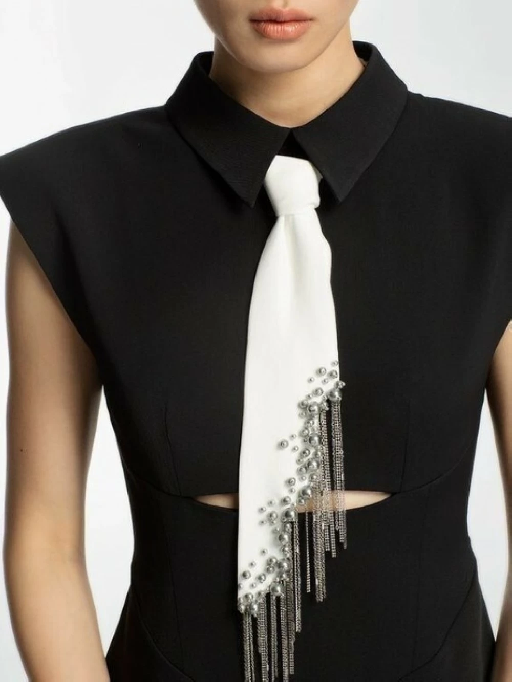 The embroidered tie gives women the opportunity to experiment with a style that balances sophistication and uniqueness, making the look eye-catching without being excessive.