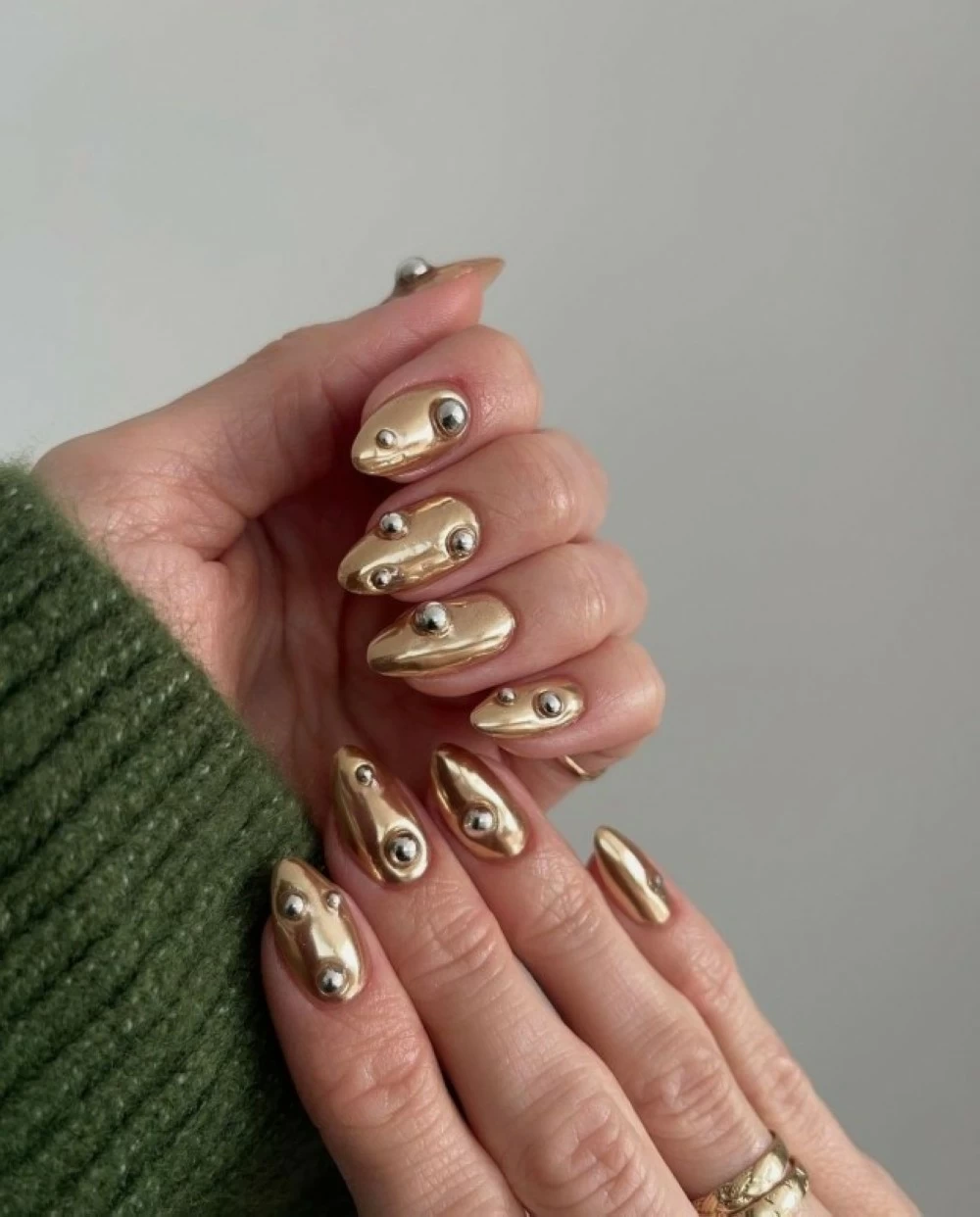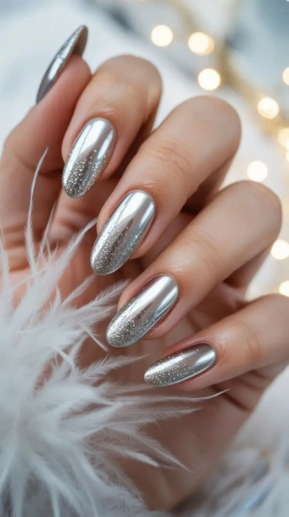 Metallic nails are among the most prominent beauty trends associated with New Year's Eve looks, as they carry a festive character that reflects the spirit of the occasion and gives the appearance a luxurious modern touch. This style relies on high-end metallic shine that ranges from chrome silver to warm gold and dark bronze, making it an ideal choice to coordinate with evening wear and elegant dresses. Metallic nails are not limited to boldness alone; they can also be executed in a soft and elegant style that suits various tastes, whether through full coverage or light touches that add a calculated sparkle. This trend has gained widespread popularity in year-end looks, as it reflects a sense of celebration and sophistication at the same time, and is considered a perfect complement to a New Year's Eve look that seeks distinction without excess.