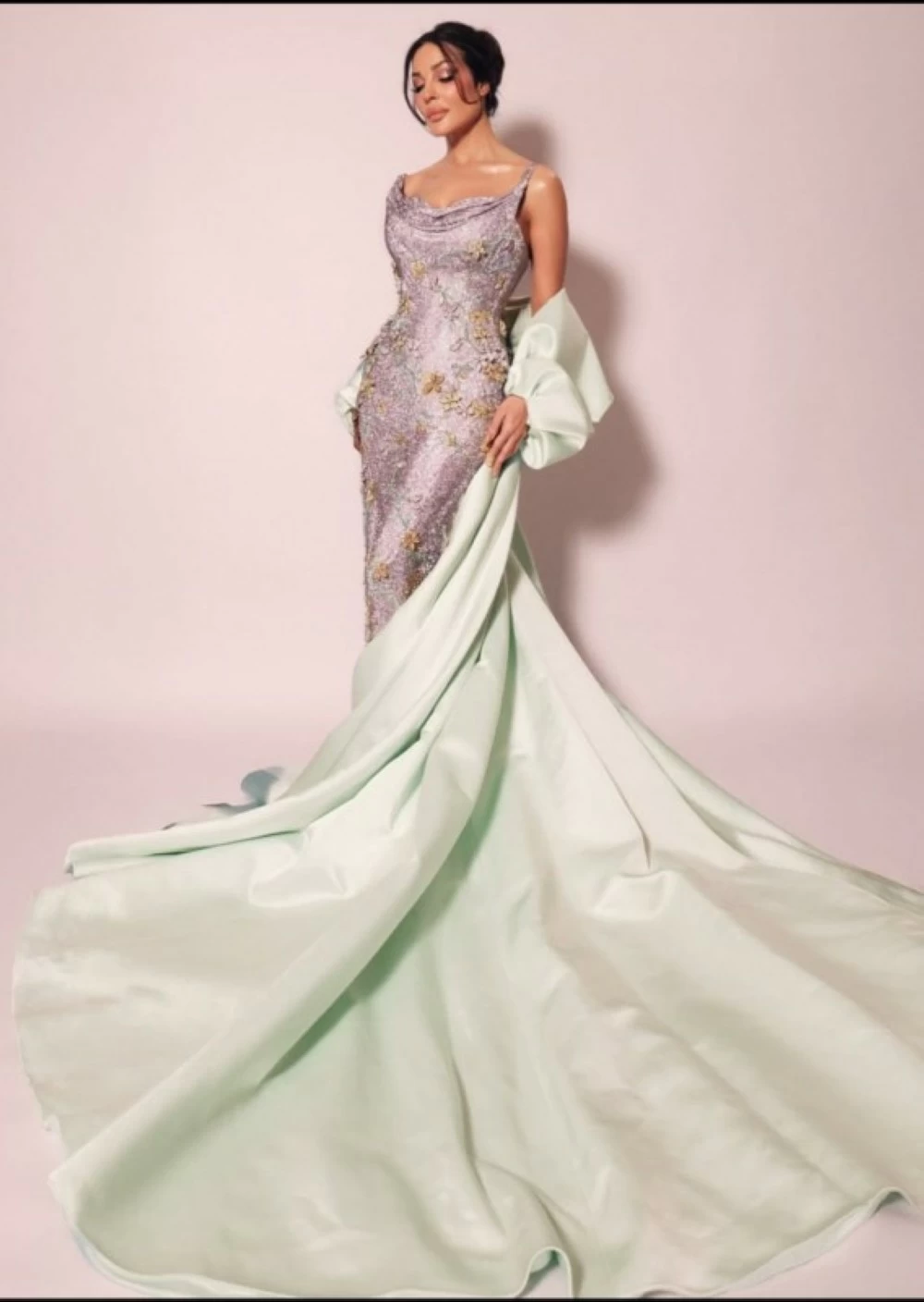 بلقيس فتحي اختارت فستاناً وردياً من طبقات التول الثقيلة، شكّل حركة وانسيابية ساحرة على السجادة البنفسجية، وكان تصميمه براقاً في طابعه الرومانسي مع لمسة أنثوية قوية.